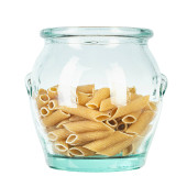 Suszony włoski makaron spiralny Fusilli w otwartym szklanym, owalnym słoiku ze szklaną pokrywą izolowaną na białym tle