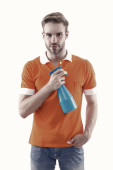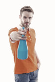 Trzymaj dom w bezpyłowym stanie. Przystojniak trzyma butelkę ze sprayem higienicznym. Środki dezynfekujące i antybakteryjne w higienie w domu. Sprzątanie domu. Czystość i higiena. Mikroby stop używać dobrej higieny