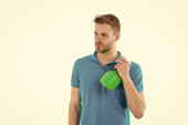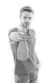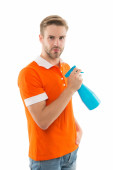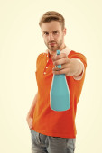 Zdjęcie "Trzymaj dom w bezpyłowym stanie. Przystojniak trzyma butelkę ze sprayem higienicznym. Środki dezynfekujące i antybakteryjne w higienie w domu. Sprzątanie domu. Czystość i higiena. Mikroby stop używać dobrej higieny" może być wykorzystywane do celów osobistych i komercyjnych zgodnie z warunkami zakupionej licencji Royalty-free. Obraz jest dostępny do pobrania w jakości wysokiej rozdzielczości do 5760x3840.