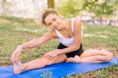 Szczupłe młode kobiety uprawiające jogę w parku publicznym rano, Żeński trening na zielonej trawie