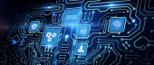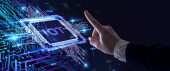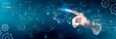 Koncepcja prywatności technologii bezpieczeństwa cybernetycznego. Młody biznesmen wybierz bezpieczeństwo ikony na wirtualnym wyświetlaczu.