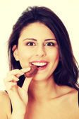blondynka młoda kobieta gryzienie czekolady na białym tle