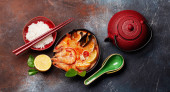 Zdjęcie "Tom Yum tradycyjnej tajskiej zupy z owoców morza, grzyby, mleko kokosowe i gorące przyprawy. Z zieloną herbatą i miską. Widok z góry" może być wykorzystywane do celów osobistych i komercyjnych zgodnie z warunkami zakupionej licencji Royalty-free. Obraz jest dostępny do pobrania w jakości wysokiej rozdzielczości do 5760x3840.