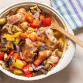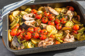 Domowej roboty gulasz z kurczaka z warzywami w dużym garnku - zdrowa żywność ekologiczna.