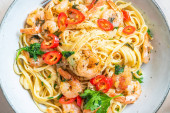 Makaron linguine z krewetkami, pietruszka i pieprz chili zbliżenie, makro. Tradycyjny makaron śródziemnomorski z owocami morza, kuchnia włoska.