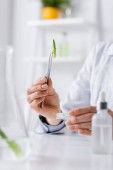przycięty widok lekarza w białym płaszczu trzymającego cyfrową tabletkę z czystym ekranem w pobliżu butelek z cbd i medycznym napisem marihuany w klinice