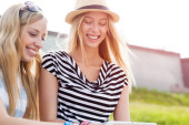 dwie dziewczyny w parku, patrząc na zdjęcia w aparacie