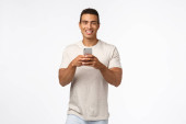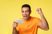 Zdjęcie "Wesoły przystojny nowoczesny facet z tatuażem na ramieniu, trzymając smartfona, pokazując ekran komórkowy i zrobić znak pokoju, uśmiechnięty zadowolony, chwalić zdjęcia z wakacji, aplikacja doradztwo, promować sklep internetowy" może być wykorzystywane do celów osobistych i komercyjnych zgodnie z warunkami zakupionej licencji Royalty-free. Obraz jest dostępny do pobrania w jakości wysokiej rozdzielczości do 5760x3840.