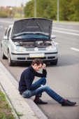 Kobieta czeka na pomoc w pobliżu samochodu zepsutego na drodze.