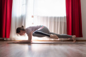 Zdjęcie "Sportowa, atrakcyjna młoda kobieta uprawiająca zakręt boczny, Trikonasana postawy, Triangle Pose w swoim salonie. Zostań w domu i ćwicz jogę." może być wykorzystywane do celów osobistych i komercyjnych zgodnie z warunkami zakupionej licencji Royalty-free. Obraz jest dostępny do pobrania w jakości wysokiej rozdzielczości do 5760x3840.