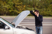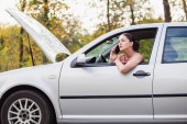Młoda kobieta smutna w samochodzie, bo się zepsuł.