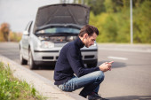 Młoda kobieta wzywa służbę ewakuacyjną. Jej samochód się zepsuł.