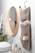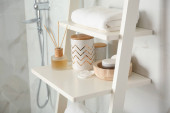 Regał z zestawem kosmetyków w stylowym wnętrzu łazienki