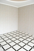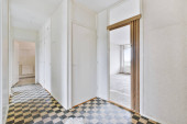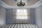 Klasyczne puste wnętrze z lekką ścianą, płytkami na podłodze, oknem i zasłoną.