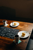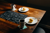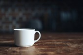 Kubek na drewnianym stole w salonie. Tło z wolnym miejscem tekstowym.