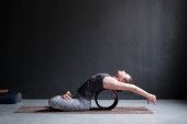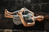 Zdjęcie "Sportowa kobieta kłamie i robi rozciąganie ćwiczenia jogi asana pavanamuktasana w salonie w domu" może być wykorzystywane do celów osobistych i komercyjnych zgodnie z warunkami zakupionej licencji Royalty-free. Obraz jest dostępny do pobrania w jakości wysokiej rozdzielczości do 5760x3840.