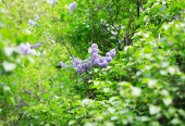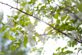 Białe i żółte kwiaty drzew i zielone liście wiosennego drzewa