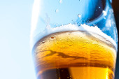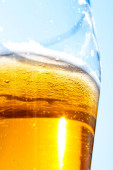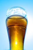 Jasne piwo w szklanym kielichu na tle błękitnego nieba. Piwo piankowe na ścianach szklanki w słońcu