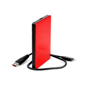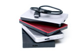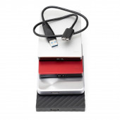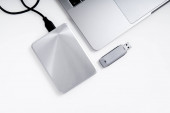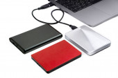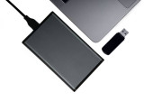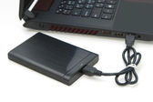Ciemnoszary przenośny dysk twardy podłączony do laptopa za pomocą adaptera izolowanego na biało.
