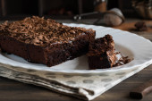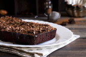 Domowej roboty ciasto czekoladowe z piankami i orzechami włoskimi. Prosty deser czekoladowy