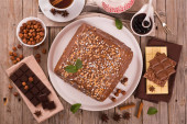 Domowej roboty ciasto czekoladowe z piankami i orzechami włoskimi. Prosty deser czekoladowy