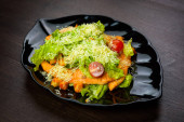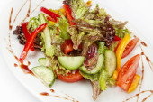 Sałatka witaminowa ze świeżymi warzywami na białym talerzu, zbliżenie