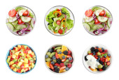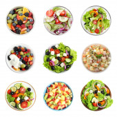 Zestaw z różnymi sałatkami na białym tle, widok z góry