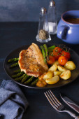 Pieczona wieprzowina z warzywami na czarnym talerzu. obraz poziomy