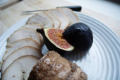 Na papierze pergaminowym tradycyjne niemieckie danie, ziemniaki i smażone kiełbaski