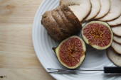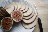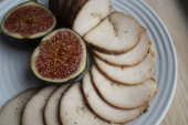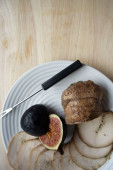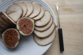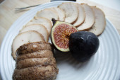 Na papierze pergaminowym tradycyjne niemieckie danie, ziemniaki i smażone kiełbaski