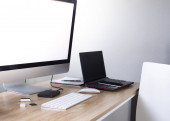 Przycięte zdjęcie stylowego biurka z pustym ekranem urządzenia cyfrowe, materiały biurowe, aparat fotograficzny i kubek do kawy na białym stole