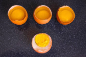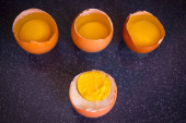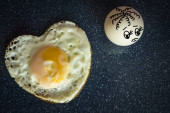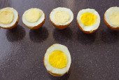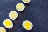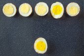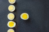 Gotowane jajka są krojone. Jeden, przecinający się, szuka swojej połowy. Inny, inny wśród wielu, jest wyjątkowy. Ciemne tło, widok z góry.