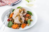 Wieprzowina z ciecierzycą i szpinakiem. Przestrzeń kopiowania.
