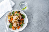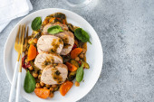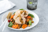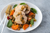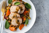 Zdjęcie "Wieprzowina z ciecierzycą i szpinakiem. Przestrzeń kopiowania." może być wykorzystywane do celów osobistych i komercyjnych zgodnie z warunkami zakupionej licencji Royalty-free. Obraz jest dostępny do pobrania w jakości wysokiej rozdzielczości do 5760x3840.