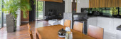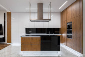 Zdjęcie "Panorama stylowej kuchni z drewnianymi, białymi i czarnymi szafkami" może być wykorzystywane do celów osobistych i komercyjnych zgodnie z warunkami zakupionej licencji Royalty-free. Obraz jest dostępny do pobrania w jakości wysokiej rozdzielczości do 5760x3840.