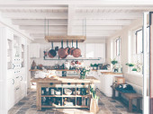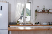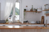Zdjęcie "Jasne wnętrze kuchni z drewnianymi detalami i dużymi oknami" może być wykorzystywane do celów osobistych i komercyjnych zgodnie z warunkami zakupionej licencji Royalty-free. Obraz jest dostępny do pobrania w jakości wysokiej rozdzielczości do 5760x3840.