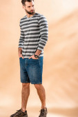 przystojny mężczyzna pozowanie w szorty i lato t-shirt gospodarstwa okulary przeciwsłoneczne na beżowy