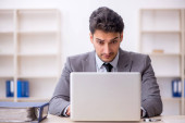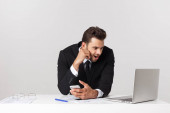 Poważny przystojny biznesmen pracujący w biurze, widok z przodu z laptopem, odizolowany na biało.