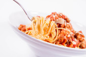 Spaghetti bolognese na talerzu ozdobionym gałązką rozmarynu i posypane serem