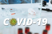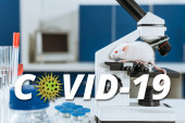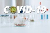 selektywne skupienie weterynarza w masce medycznej i rękawicach lateksowych trzymających białą mysz za ogon w pobliżu probówek, ilustracja COVID-19