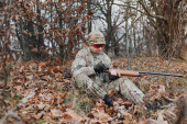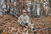 Zezwolenie na polowanie. Człowiek brutalny gajowy środowiska naturalnego. Myśliwy spędza wolny czas na polowaniu. Hunter trzyma karabiny. Skupienie i koncentracja doświadczonego myśliwego. Sezon łowiecki i pułapkowy.