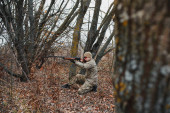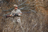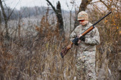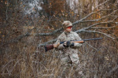 Zdjęcie "Łowca przystojny facet z bronią. Hunter spędza wolny czas na polowaniu. Sprzęt myśliwski. Brutalne męskie hobby. Człowiek obserwujący środowisko naturalne. Hunter trzymaj karabin. Środki bezpieczeństwa. Środowisko naturalne." może być wykorzystywane do celów osobistych i komercyjnych zgodnie z warunkami zakupionej licencji Royalty-free. Obraz jest dostępny do pobrania w jakości wysokiej rozdzielczości do 5760x3840.