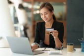 Zdjęcie "Bizneswoman trzyma kartę kredytową, używa smartfona do zakupów online, siedzi w biurze. Freelancer otrzymać płatność, stan konta. Uśmiechnięta kobieta zamawiająca jedzenie, bilety rezerwacyjne na stronie internetowej" może być wykorzystywane do celów osobistych i komercyjnych zgodnie z warunkami zakupionej licencji Royalty-free. Obraz jest dostępny do pobrania w jakości wysokiej rozdzielczości do 5760x3840.