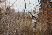 Łowca w mundurze ze strzelbą myśliwską. Koncepcja łowiecka