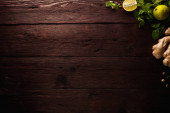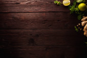 Pieprz, czosnek, imbir, liść laurowy, przyprawy, wapno, drewniana łyżka z solą na ciemnym drewnianym tle. Układ tła z wolną przestrzenią tekstową. Odbiór. Widok góry. Żywność płaska