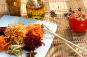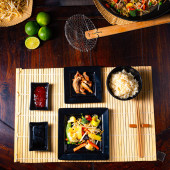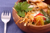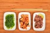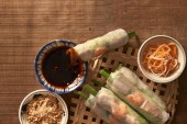 różnorodność dań mięsnych z warzywami na stole widok z góry.
