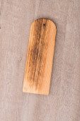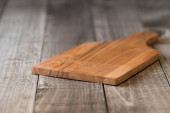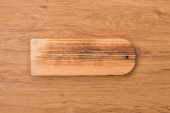 Widok z góry drewniana deska do cięcia na starym ciemnym drewnianym blatem.