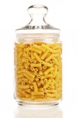 Suszone włoskie makarony spiralne Fusilli w leżącej przezroczystej szklanej butelce z zamkniętą pokrywą korkową izolowaną na białym tle