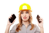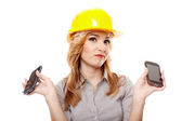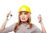 wesoły kobieta inżynier ochrony hełmie i gospodarstwa