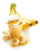 smaczny deser w otwartych plastyczny grzebień Puchar i miód, banan, na białym tle